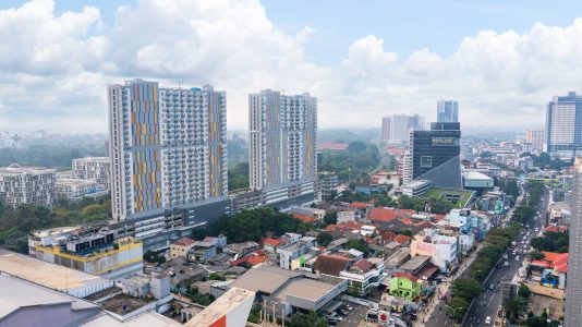 Drone View Apartemen Samesta Mahata Margonda. Dengan Lokasi Strategis di Jantung Kota Depok, Memberikan Akses Langsung ke Fasilitas Pendidikan dan Transportasi